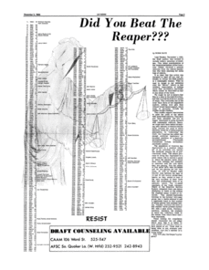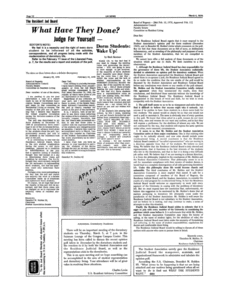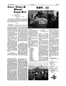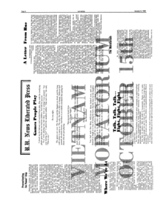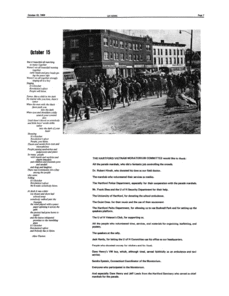 Year 2 (9/695/70), Part 3 October 15, 1969 Moratorium Day. A march that was organized locally by what was left of the SDS and various participating colleges in the Hartford Area including the SA of UH led by Ben Holden with Jack as part of the march preparations. There was much discussion and publicity leading to the march which was part of a Nationwide Protest of US Involvement in the Vietnam War. At this point; many knew there was infiltration into the ranks by the FBI that had led to an earlier demonstration in New Haven that turned into a deliberately instigated riot. The concern was great; but due to the careful and meticulous planning of the parade and events; it was a huge success and went off without a hitch. An area of great concern was when the march went through the poorer sections of Hartford; but much to the relief and joy of the marchers and organizers there were supporting signs cheering and waving throughout the area with some even joining the march. A nearly flawless march and events of the Moratorium demonstrated the solidarity, leadership and total cooperation of the community during the event. This was one of Hartford's finest hours.